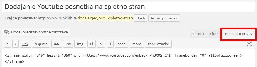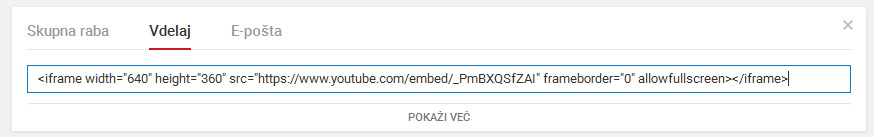 3. Izberite možnost ‘Vdelaj‘ in kopirajte kodo v urejevalnik prispevka v administraciji vaše spletne strani. Urejevalnik naj bo v načinu ‘Besedilni prikaz‘, kot je prikazano na spodnji sliki.