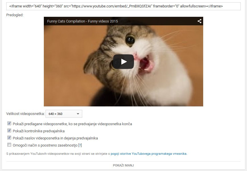 Če bi radi spremenili dimenzije video posnetka, lahko naredite tudi to, in sicer vam je možnost na voljo direktno na Youtube strani. Pod kodo boste našli povezavo ‘POKAŽI VEČ‘ oziroma ‘SHOW MORE‘.