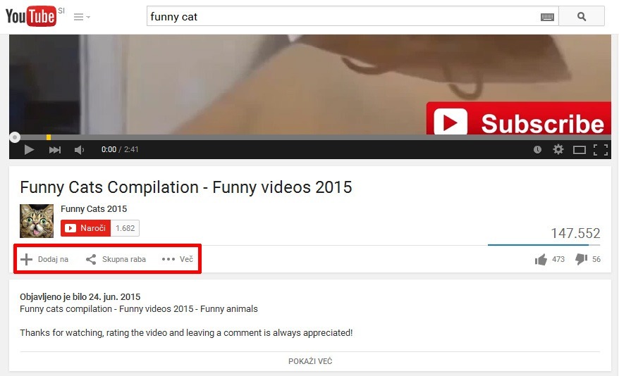 1. Najprej obiščite želeno spletno stran na Youtube-u. Pod video posnetkom se nahaja naslov posnetka, pod naslovom pa boste videli tri možnosti za klik: