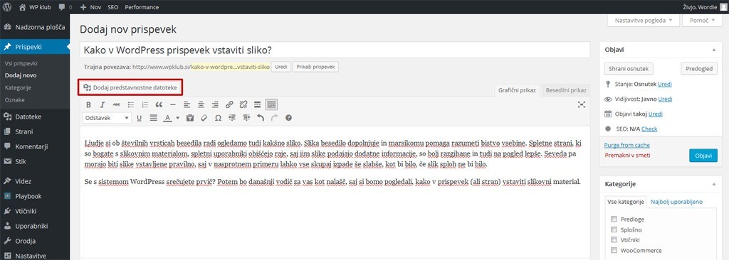 Z miško se postavite na mesto, kamor želite vnesti sliko. Kliknite na gumb ‘Dodaj predstavnostne datoteke‘, ki se nahaja nad urejevalnikom besedila v posameznem prispevku.