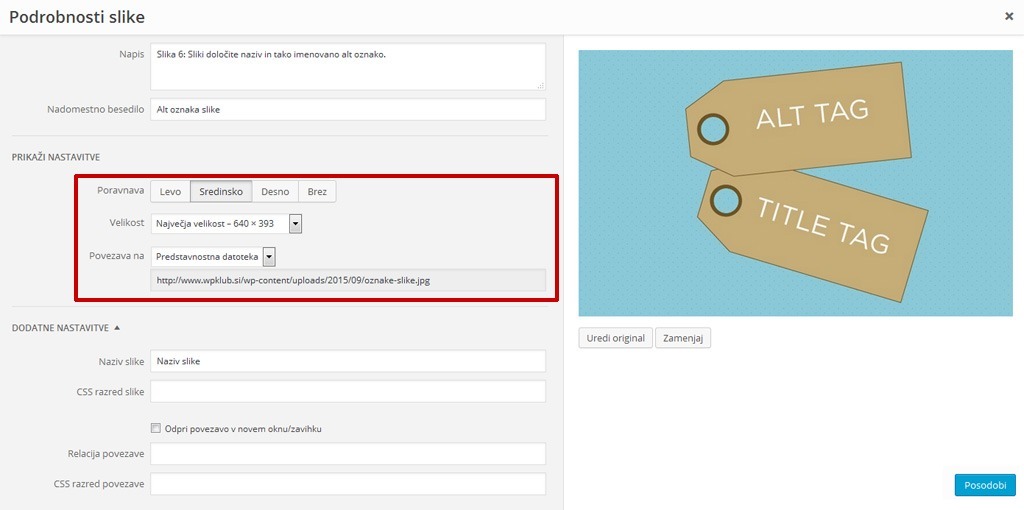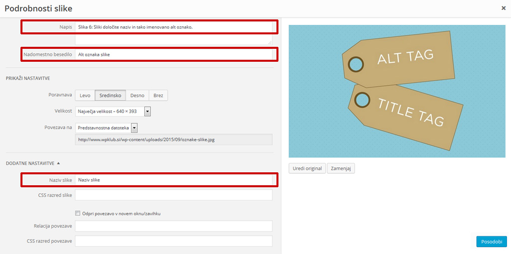Sedaj imate odprt urejevalnik slike. Vneseni sliki dodajte ime slike, tako imenovano alt oznako in, če želite, tudi kratek opis pod sliko, ki mu s tujko pravimo caption. Najprej si na spodnji sliki oglejte, kako to storite, nato pa si preberite še razlage posameznih elementov.