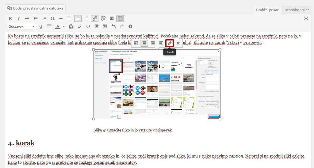 Čestitamo, sliko ste vstavili v prispevek. A z delom še niste povsem končali, saj je najbrž potrebno prilagoditi dimenzije slike, prav tako pa je sliko potrebno opremiti z nekaterimi oznakami. Najprej z levim miškinim klikom kliknite na v prispevek dodano sliko, nato pa se vam bo nad njo izrisalo nekaj ikon. Kliknite na predzadnjo (svinčnik), kot prikazuje spodnja slika.