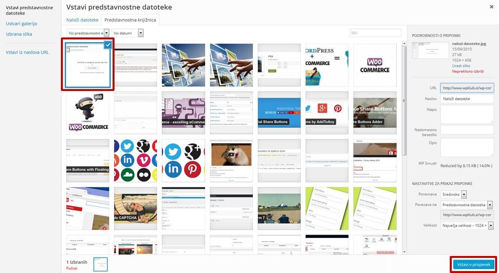 Ko boste na strežnik namestili sliko, se bo le-ta pojavila v predstavnostni knjižnici. Počakajte nekaj sekund, da se slika v celoti prenese na strežnik, nato pa jo, v kolikor še ni označena, označite, kot prikazuje spodnja slika (bela kljukica na svetlo modrem ozadju). Kliknite na gumb ‘Vstavi v prispevek‘.